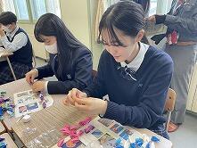 留萌市で8月に行っている平和祈念式典に向けて、ボランティア部では毎年千羽鶴の製作ボランティアを行っています。今年度は、6月11日(火)の放課後に留萌市の方を講師にお迎えして、千羽鶴の製作方法の講習会を行いました。製作方法を教えてもらった後は、実際に千羽鶴を作りながら、講師の方からアドバイスをもらっていました。