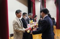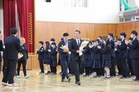 続いて行われた離任式では、今年度をもって本校を離れる先生方の紹介がありました。先生方からは、本校での思い出や生徒への温かいメッセージが語られました。また、生徒を代表して、生徒会役員から感謝の気持ちを込めて花束を贈りました。